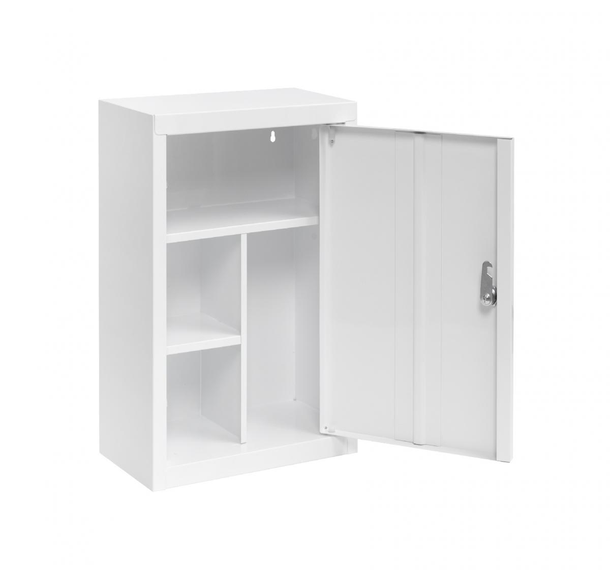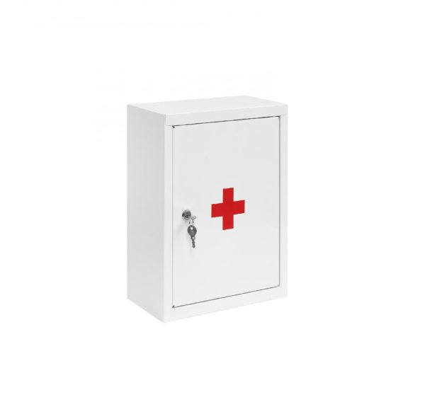 Металлический шкаф для хранения медикаментов белого цвета. В комплекте: замок, два ключа, наклейка.