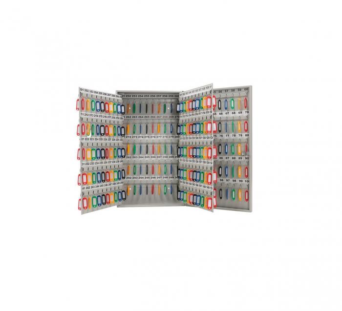 Металлическая ключница-шкаф, предназначенная для хранения 300 комплектов ключей и бирок. Такая ключница обычно используется в больших организациях и государственных компаниях. Окрашена серой порошковой краской, имеет 3 подвижные части. Устанавливается на саморезы к стене. Для надежной фиксации рекомендуется устанавливать на 4 точки, так ключница имеет относительно большую массу 12.4 кг.